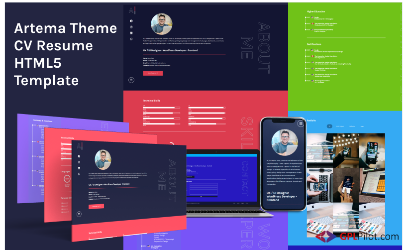 This is is a one page resume resume theme, with cute color variants that highlights the information for easy viewing. You can have an excellent online resume with section like About me, Skills, Experience, Studies and Certifications, Portfolio and Contact with a fully functional form. The design is multi-responsive and fully adapts to each device. You can change your design completely and easily thanks to our documentation.