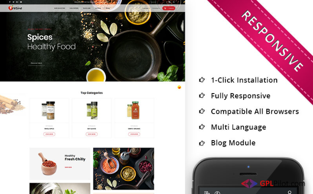 Fretine Spices Ecommerce template built in Opencart framework which is fully responsive and fit into any media devices. It is Modern, Clean and Professional site template that is perfect for grocery store, Bakery, Cafe, Bar, Catering, food business. Template using advanced Bootstrap 4 Framework with HTML5/CSS3. It has clean and clear code highly customizable – looks awesome on tablets and mobile devices.