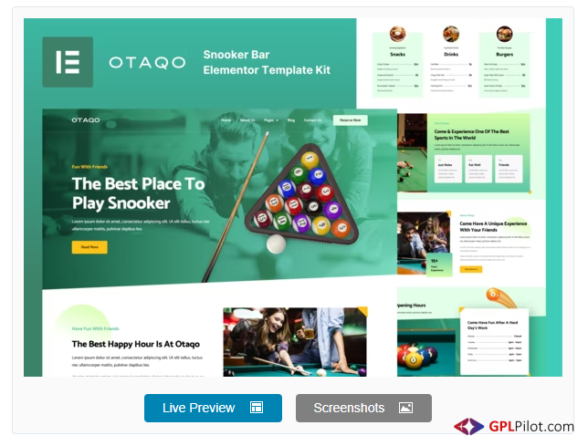 You can get Otaqo - Snooker & Pool Bar Elementor Template Kit here on a huge discount on individual purchase, If you buy GPLpilot membership then You can free download Otaqo - Snooker & Pool Bar Elementor Template Kit as well as You will get access to all the products (31141) free like WordPress, Woocommerce, Joomla, Drupal, Magento, Muse, Opencart, Prestashop, Shopify, Unbounce, Ghost, Tumblr, Virtuemart, Graphics, Html templates, Php script and more … free! We provide an automatic upgrade service for the wp plugin, GPLpilot provides 24/7 hour support by Email, Live chat, Whatsapp, Skype, as well as Phone Call support.